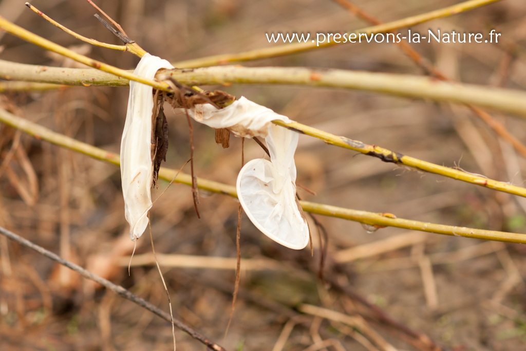 Si l’agglomération orléanaise peut revendiquer plus de 250 hectares de réserve naturelle nationale avec la réserve de Saint-Mesmin, il semble qu’il y ait encore beaucoup d’efforts à concrétiser par les communes. En effet, nous avons réalisé un échantillonnage des déchets sur les berges de la Loire sur environ 250 mètres dans la commune de Saint-Jean-de-la-Ruelle (juste après le pont de l’Europe). Il est troublant de constater qu’outre les nombreux plastiques, de très nombreux déchets tels qu’une quantité phénoménale de serviettes hygiéniques et de lingettes a été retrouvée aussi bien sur les berges, que dans les sédiments du bord de Loire. Nous avons même retrouvé des supports plastiques de détartrants de WC. Des préservatifs ont été aussi photographiés dans l’eau et le très proche bord de Loire. Nous nous interrogeons sur la provenance de ces derniers déchets qui semblent indiquer qu’ils seraient issus des WC domestiques. Il ne serait donc pas si étonnant de découvrir des branchements « sauvages » d’eaux usées dans le réseau d’évacuation d’eaux de pluie.