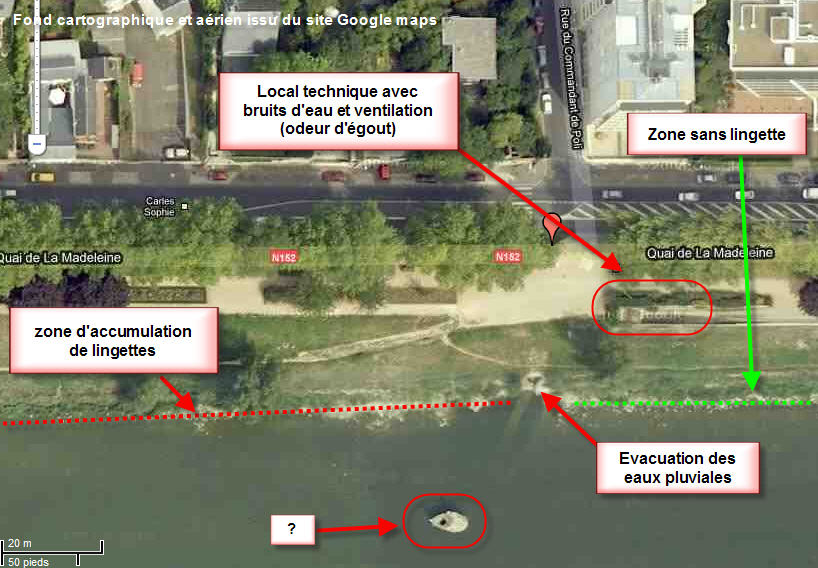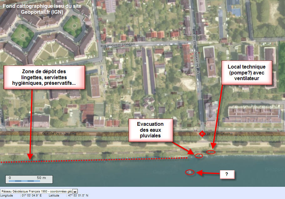 Il semble que nous ayons déterminé l’origine de cette pollution. Une sortie d’évacuation d’eaux pluviales d’Orléans déverseraient ces déchets dans la Loire en face du 14 quai Madeleine, quasiment en face de la rue du Commandant Poli. Voici la localisation exacte :