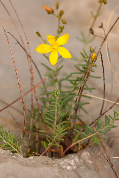 La hauteur de cette plante vivace varie de 10 cm à 40 cm. La plante est glabre. Elle comporte une tige souterraine ligneuse. Les feuilles sont linéaires et forment des verticilles sur la tige. Le bord des feuilles est enroulé vers le bas. Les sépales sont obtus avec des glandes noirs sur les bords. Les pétales sont de couleur jaune, parfois striés de rouge. Ils sont 4 à 5 fois plus long que les sépales. Les fruits sont contenus dans une capsule ovale.