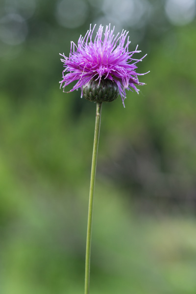 La hauteur de cette plante vivace varie de 30 à 120 cm. Les feuilles basales sont longuement pétiolées. Elles sont de forme ovale et sont dentées. Elles se dessèchent à la floraison. Les feuilles caulinaires, bien présentes à la floraison, sont lyrées à pennatipartites. Ces feuilles sont pubescentes et possèdent des petites épines. La tige vers le haut est complètement nue : au somment se trouve un capitule unique. L’involucre est de forme globulaire et comporte de nombreuses bractées mucronées, vertes et luisantes qui se recouvrent les unes les autres. La couleur de la fleur est rose.