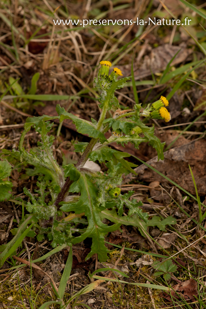 De même le Séneçon commun (Senecio vulgaris) avec ses fleurs jaunes est un habitué des milieux anthropiquement perturbés. Il fait partie de la famille des Astéracées (anciennement appelée Composées). Notons que dans cette famille, le néophyte aura tendance à appeler fleur en fait un groupement de fleurs spécialisées. En effet, par exemple, la marguerite n’est pas une fleur mais un ensemble de fleurs. Voici donc le Séneçon commun que vous reconnaîtrez très facilement :