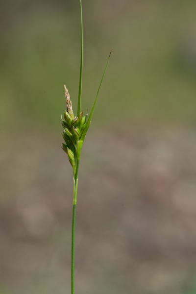 Plante vivace de 10 à 40 cm, glabre, à souche gazonnante ; tige égalant ou dépassant les feuilles étroites (2 à 3 mm), rude ; épi mâle terminal solitaire, subsessile, oblong, panaché de roux et de blanc, à écailles obtuses ; épis femelles subglobuleux, pauciflores, 2 à 4 rapprochés de l’épi mâle et subsessiles, 1 à 3 solitaires sur de longs pédoncules basilaires filiformes décombants ; bractées engainantes, à pointe herbacée ; écailles acuminées, fauves-scarieuses ; 3 stigmates ; utricules gris fauve, à peine pubérulents, obovales-trigones (5 mm), fortement nervés, à bec très court dépassant un peu l’écaille.