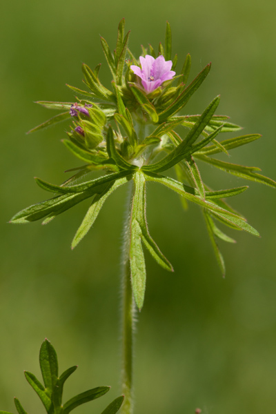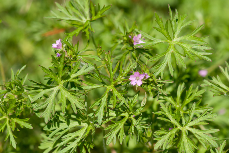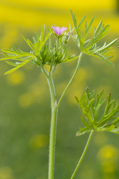 Plante annuelle, couverte de poils étalés ; tiges de 10 à 40 cm, dressées ou ascendantes ; feuilles orbiculaires, palmatiséquées à 5 à 7 segments découpés presque jusqu’au pétiole en lobes linéaires ; fleurs purpurines, petites ; pédoncules biflores, plus courts que la feuille ou l’égalant ; pédicelles à peine plus longs que le calice ; sépales étalés, aristés, non courbés par les bords, à poils étalés et glanduleux ; pétales émarginés, égalant le calice, à onglet court et cilié ; étamines à filets ciliés inférieurement ; carpelles pubescents-glanduleux, non ridés.