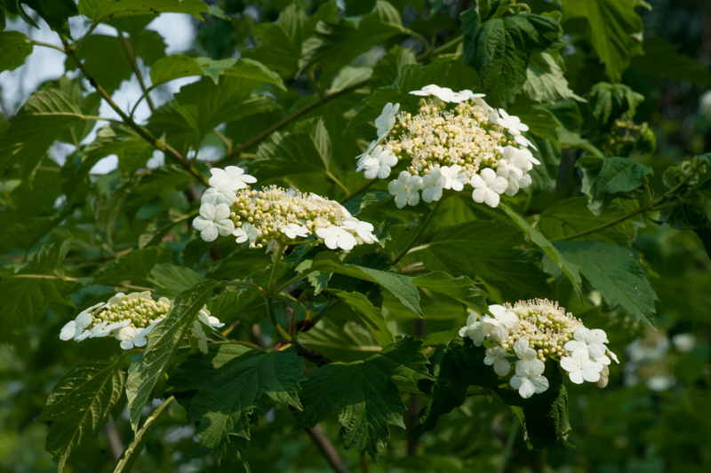 Arbrisseau de 2-4 mètres, à rameaux fragiles, glabres, d’un gris blanchâtre ; feuilles caduques, minces, légèrement pubescentes en dessous, largement ovales, à 3 5 lobes sinués-dentés, aigus ; pétiole allongé, glabre, muni à la base de stipules linéaires ; corymbes assez longuement pédoncules, peu serrés ; fleurs blanches, inodores, les centrales petites et régulières, les extérieures bien plus grandes, rayonnantes, à lobes inégaux, stériles ; baies globuleuses, d’un rouge vif à la maturité.