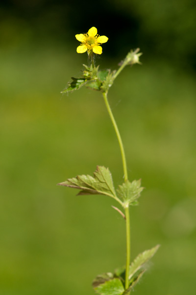 Plante de 20-60 cm, velue, peu rameuse, à souche courte, munie de fibres à odeur de girofle ; feuilles inférieures lyrées-pennatiséquées, à 5-7 segments très inégaux, incisés-dentés ; les caulinaires grandes ; stipules foliacées, suborbiculaires, incisées-dentées ; fleurs jaunes, petites, dressées, en cymes pauciflores ; calice vert, réfléchi sous le fruit ; 5 pétales, obovales en coin, dépassant un peu le calice ; styles articulés vers le quart supérieur ; carpelles oblongs, à arête glabre, arquée-réfléchie, réunis en tête sessile au fond du calice.