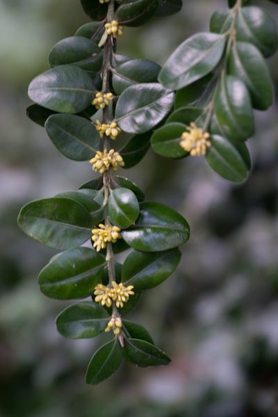 Arbrisseau touffu de 1-5 mètres, à bois jaunâtre très dur, à jeunes rameaux tétragones pubérulents ; feuilles opposées, ovales ou lancéolées, brièvement pétiolées, entières, coriaces, persistantes, glabres et luisantes ; fleurs jaunâtres, sessiles, en glomérules axillaires compacts, monoïques, plusieurs mâles entourant une femelle centrale ; périanthe à 4 sépales inégaux entourés de bractéoles à la base ; 4 étamines libres, opposées aux sépales ; 3 styles courts, épais, persistants, périphériques ; capsule sessile, ovoïde à 3 cornes, coriace, glabre, s’ouvrant en 3 valves chacune à 2 graines, oblongues trigones, noires luisantes.