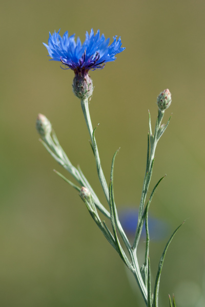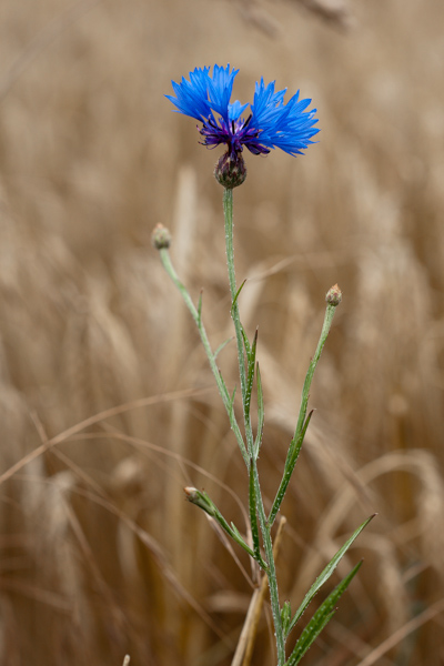 Plante annuelle ou bisannuelle de 3-8 dm, d’un vert blanchâtre un peu cotonneuse, dressée, à rameaux grêles, allongés ; feuilles non décurrentes, les inférieures pennatipartites, pétiolées, les suivantes sessiles, étroites, linéaires ; involucre ovoïde à folioles entourées d’une marge fortement décurrente et de cils courts ordinairement argentés ; akènes à ombilic barbu surmontés d’une aigrette rousse égalant à peu près leur longueur ; fleurs bleues, les extérieures rayonnantes.