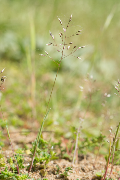 Plante annuelle de 5-35 cm, glabre, à racine fibreuse ; tiges grêles, dressées, solitaires ou en touffes peu fournies ; feuilles courtes, sétacées, à gaines presque lisses ; ligule lancéolée ; panicule courte, ovale, lâche, étalée ou divariquée, à rameaux presque lisses ; pédicellés égalant l’épillet ou 1-2 fois plus longs, épaissis obliquement sous le sommet ; épillets d’environ 3 mm oblongs, évasés, écartés ou un peu rapprochés ; fleurs munies de courts poils à la base, toutes deux aristées ; glumes aiguës, denticulées, scabres ; glumelle inférieure un peu plus courte que les glumes, acuminée, bifide, à arête presque une fois plus longue que les glumes.
