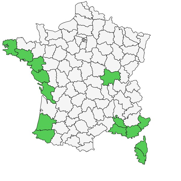 Alpes-Maritimes, Bouches-du-Rhône, Charente-Maritime, Corse-du-Sud, Finistère, Haute-Corse, Landes, Loire-Atlantique, Morbihan, Pyrénées-Atlantiques, Saône-et-Loire, Var, Vaucluse, Vendée.