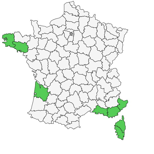 Alpes-Maritimes, Bouches-du-Rhône, Corse-du-Sud, Finistère, Gironde, Haute-Corse, Morbihan, Var.