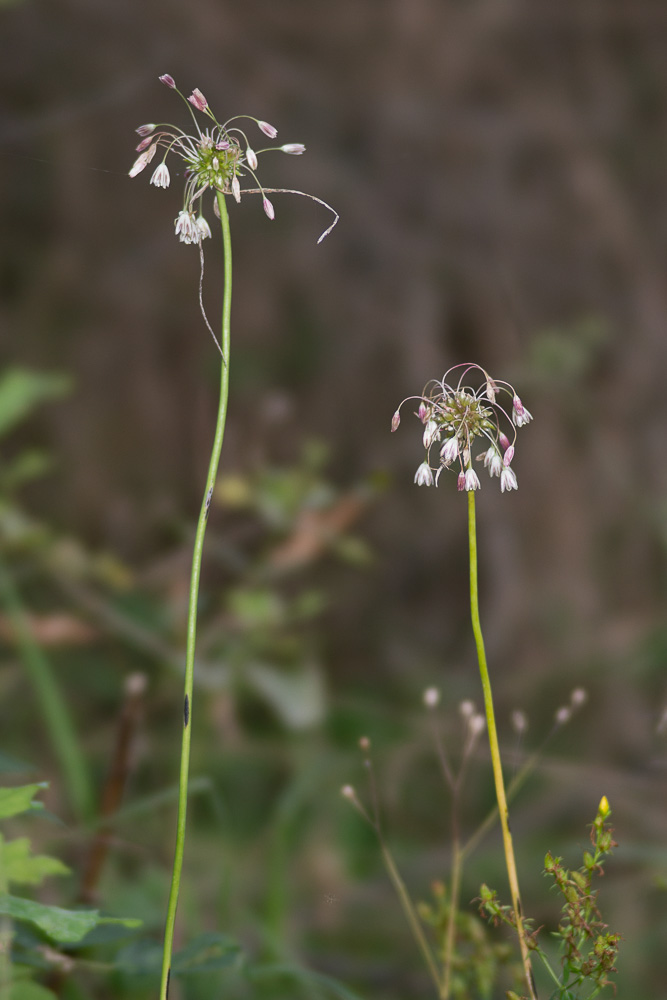 Plante vivace de 30-60 cm, glabre, à bulbe ovoïde simple ; tige cylindrique, presque pleine, feuillée jusqu’au milieu ; feuilles demi-cylindriques, creuses, canaliculées, glaucescentes ; spathe à 2 valves inégales terminées en pointe linéaire très longue; fleurs rose brun sale, peu nombreuses, en ombelle lâche munie de nombreux bulbilles ; pédicelles inégaux, les plus longs égalant 3 cm ; périanthe en cloche, à divisions obtuses ; étamines égalant le périanthe, toutes à filets simples ; capsule obovale, tronquée au sommet, rétrécie à la base.
