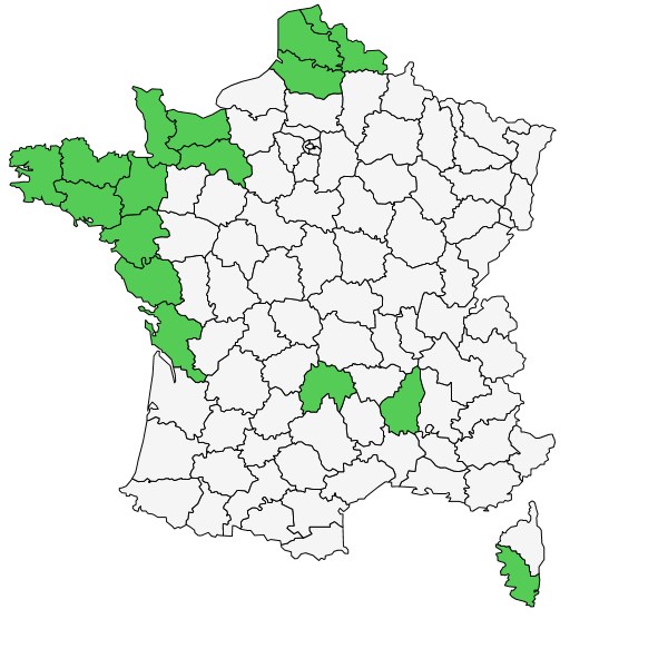 Ardèche, Calvados, Cantal, Charente-Maritime, Corse-du-Sud, Côtes-d’Armor, Finistère, Ille-et-Vilaine, Loire-Atlantique, Manche, Morbihan, Nord, Orne, Pas-de-Calais, Somme, Vendée.