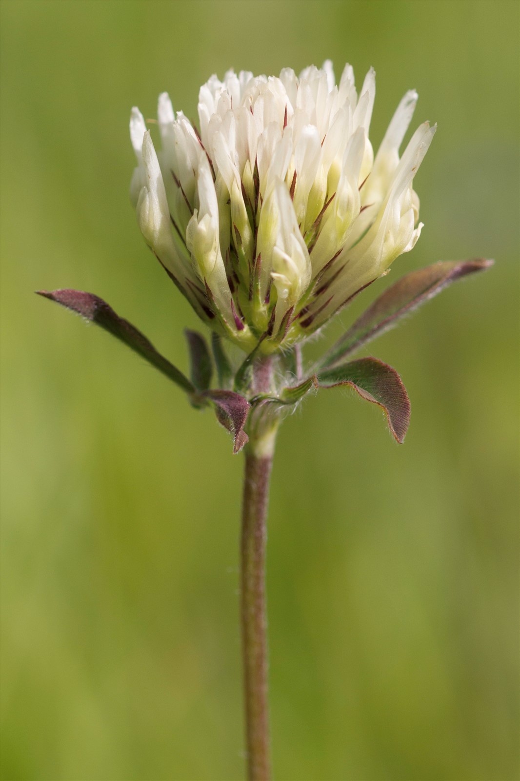 Plante vivace de 10 à 40 cm, mollement velue, ascendante, à souche dure. Feuilles supérieures opposées. Folioles obovales ou oblongues, molles, velues sur les 2 faces, entières. Stipules lancéolées, longuement aristées. Fleurs d'un blanc jaunâtre, de 16 à 20 mm de long, dressées, en têtes globuleuses, puis ovales sessiles ou brièvement pédonculées, terminales. Calice fructifère velu à 10 nervures, à gorge resserrée par 2 callosités latérales, à dents lancéolées-acuminées très inégales, l'inférieure arquée-réfléchie, plus longue que le tube.