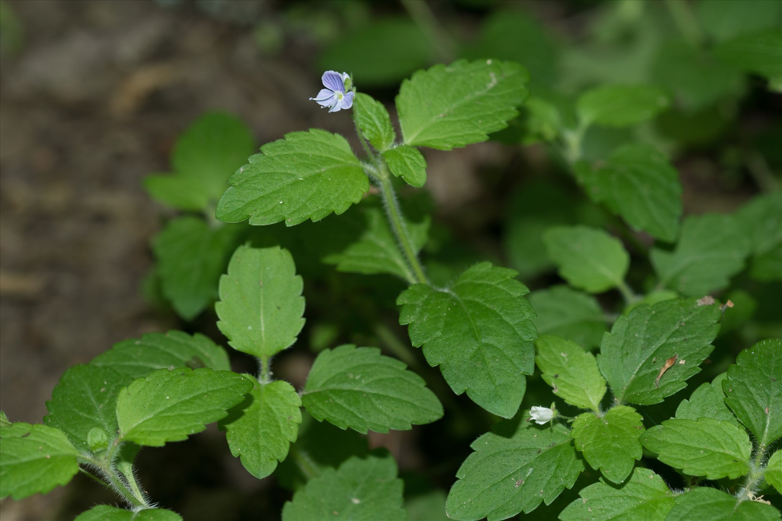 Plante vivace de 20-50 cm, velue, noircissant, à tiges couchées-radicantes, faibles ; feuilles opposées, longuement pétiolées, ovales-obtuses, fortement dentées en scie et nervées ; fleurs d'un bleu pâle, en grappes axillaires, alternes ou opposées, très lâches, pauciflores ; pédicelles filiformes, 2-3 fois plus longs que le calice et les bractées, à la fin dressés-étalés ; calice poilu, à 4 lobes peu inégaux, obovales ; corolle dépassant le calice ; style aussi long que la capsule ; celle-ci denticulée-ciliée, comprimée-ailée, émarginée au sommet et à la base, débordant de tous côtés le calice.