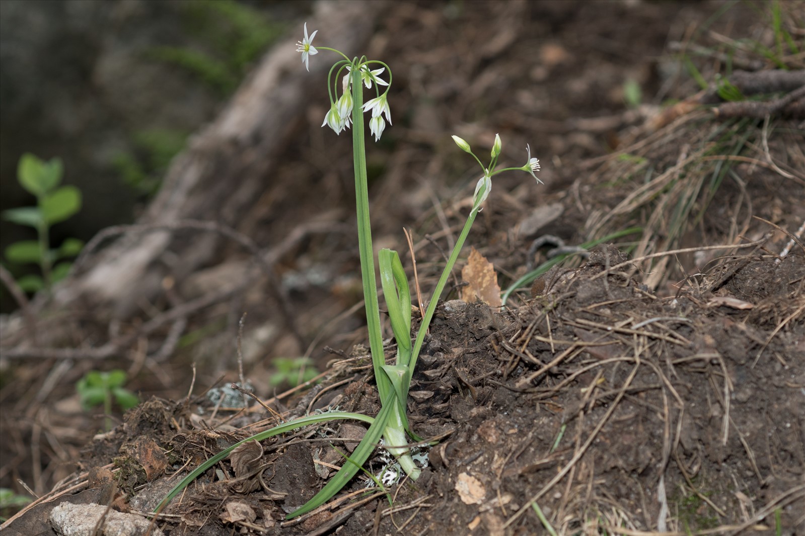 Plante vivace de 10-30 cm, très glabre, à bulbe petit ovoïde à tunique coriace brune ; tige grêle, faible, triquètre à 3 angles aigus, munie au-dessus de la base de 2 feuilles linéaires larges de 4-6 mm, planes, plus longues que l'ombelle ; spathe à 2 valves lancéolées-acuminée, ne dépassant pas les pédicelles ; fleurs blanches, grandes, d'abord dressées puis réfléchies en tous sens, 2-5 en ombelle très lâche ; pédicelles arqués, inégaux, peu épaissis au sommet ; périanthe en coupe, à la fin subglobuleux-connivent, à divisions oblongues subobtuses ; étamines incluses ; stigmate trifide.