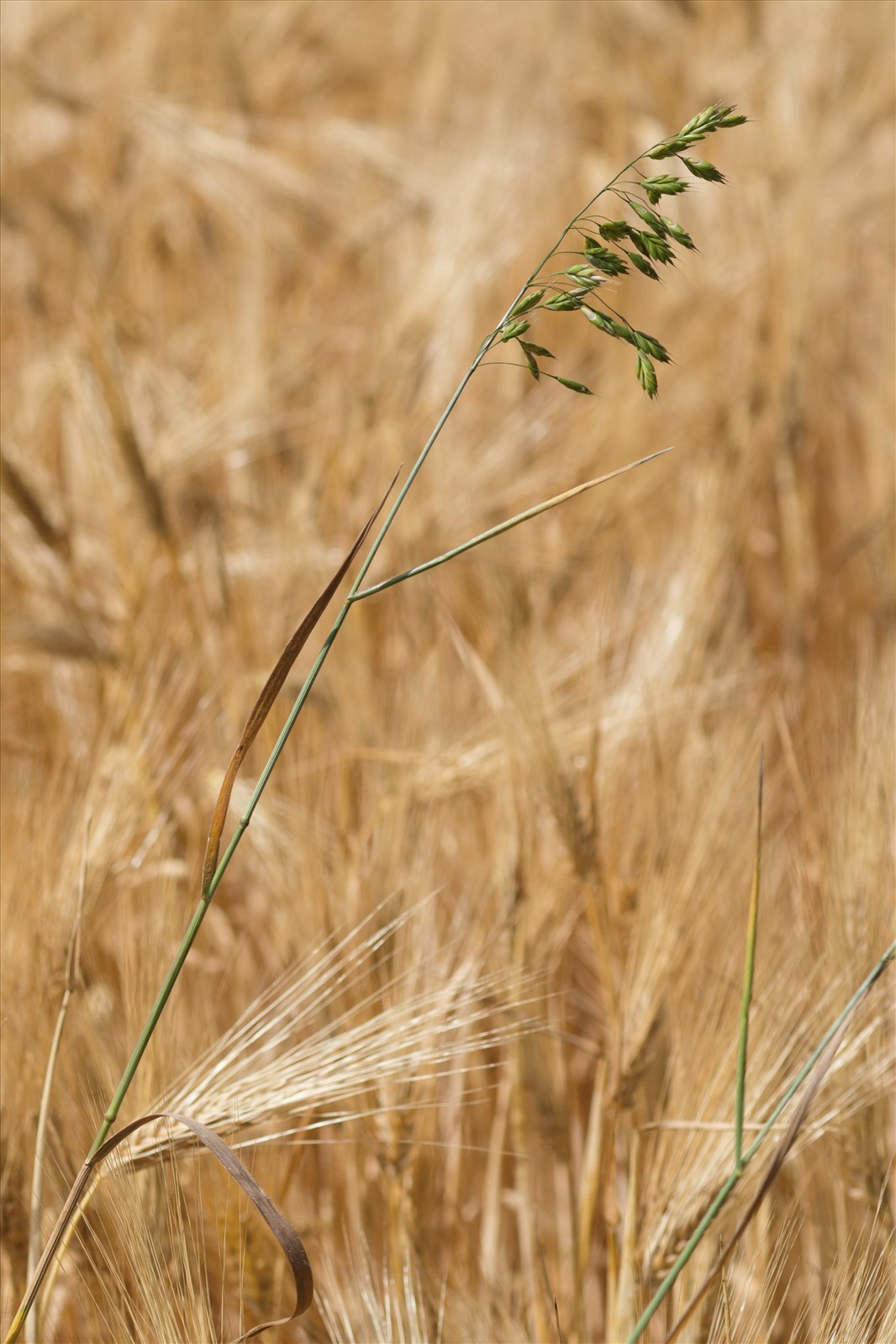 Plante annuelle de 40 à 100 cm de haut à talle solitaire ou en touffe lâche. Tige dressée, glabre, pubérulente aux noeuds. Gaine glabre, rarement pubescente dans le bas. Feuilles à face inférieure glabre, et à face supérieure à pilosité éparse. Ligule courte irrégulièrement dentée. Panicule de 7 à 20 cm, lâche, puis plus ou moins resserrée et penchée presque d'un même côté. Rameaux de la panicule jusqu'à 8 cm, plus grands que l'épillet, scabres, réunis par 3 à 6, portant 1 à 5 épillets. Epillet de 1 à 3 cm, lancéolé à l'état jeune, devenant ovale-oblong, lisse ou scabre, glabre, rarement pubescent, à 4 à 15 fleurs, d'abord imbriquées, devenant divergentes à maturité, laissant voir les rachillets. Glume inférieure largement lancéolée à 3 à 5 nervures à apex aigu , la supérieure ovale à 5 à 7 nervures à apex obtus. Lemme 6,5 à 9 mm, ovale, lisse ou scabre, glabre, à 7 nervures faibles. Arête de 3 à 8 mm, droite ou flexueuse, parfois absente.