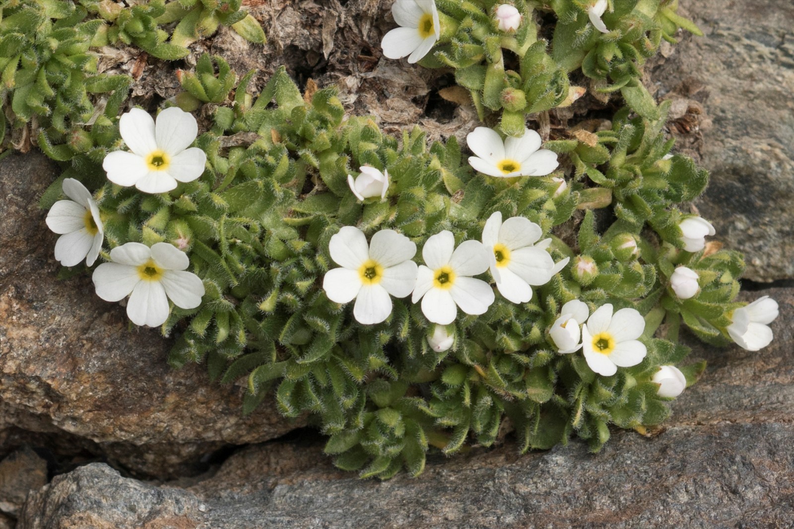 Plante vivace, naine, densément gazonnante, à souche assez grêle. Feuilles persistant sur les vieilles tiges serrées en colonnes obconiques très compactes, petites, lancéolées-oblongues, obtuses, planes, entières, pubescentes-grisâtres à poils simples ou bifurques. Fleurs solitaires, subsessiles, à pédoncules un peu épaissis sous le calice, égalant les feuilles. Calice velu, à lobes lancéolés-aigus, corolle blanche ou rosée à gorge jaunâtre, petite, de moitié plus longue que le calice. Capsule égalant à peine le calice.