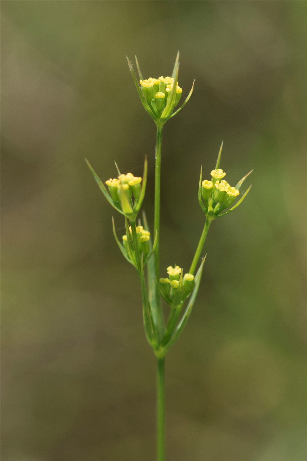 Plante annuelle glauque, grêle, dressée, souvent ramifiée, atteignant 20 à 50 cm. Tige dressée, plus ou moins flexueuse, striée. Feuilles caulinaires semi-amplexicaules, étroitement lancéolées ou linéaires, larges de 1,5 à 3 mm, à nervure médiane ne formant pas carène à la face inférieure. Ombelles peu à moyennement nombreuses 5 à 20 (40), formées de 5 à 8 rayons très inégaux, la terminale bien développée à rayons plus ou moins étalés. Involucre de 3 à 6 bractées linéaires-lancéolées , involucelles de 3 à 5 bractéoles linéaires-lancéolées ou linéaires, de longueur variable, dépassant souvent les fleurs. Pétales jaune citron ou jaunâtres, parfois pourpres, enroulés, souvent finement granuleux ou papilleux sur le dos, à lobe médian infléchi de forme variable, le plus souvent large (1/2 à 2/0 de la largeur du pétale). Fruit ovoïde-arrondi, petit (2 à 3,5 mm), brun-noir, glauque, parfois blanchâtre, lisse, parcouru de côtes étroites, à peine saillantes.