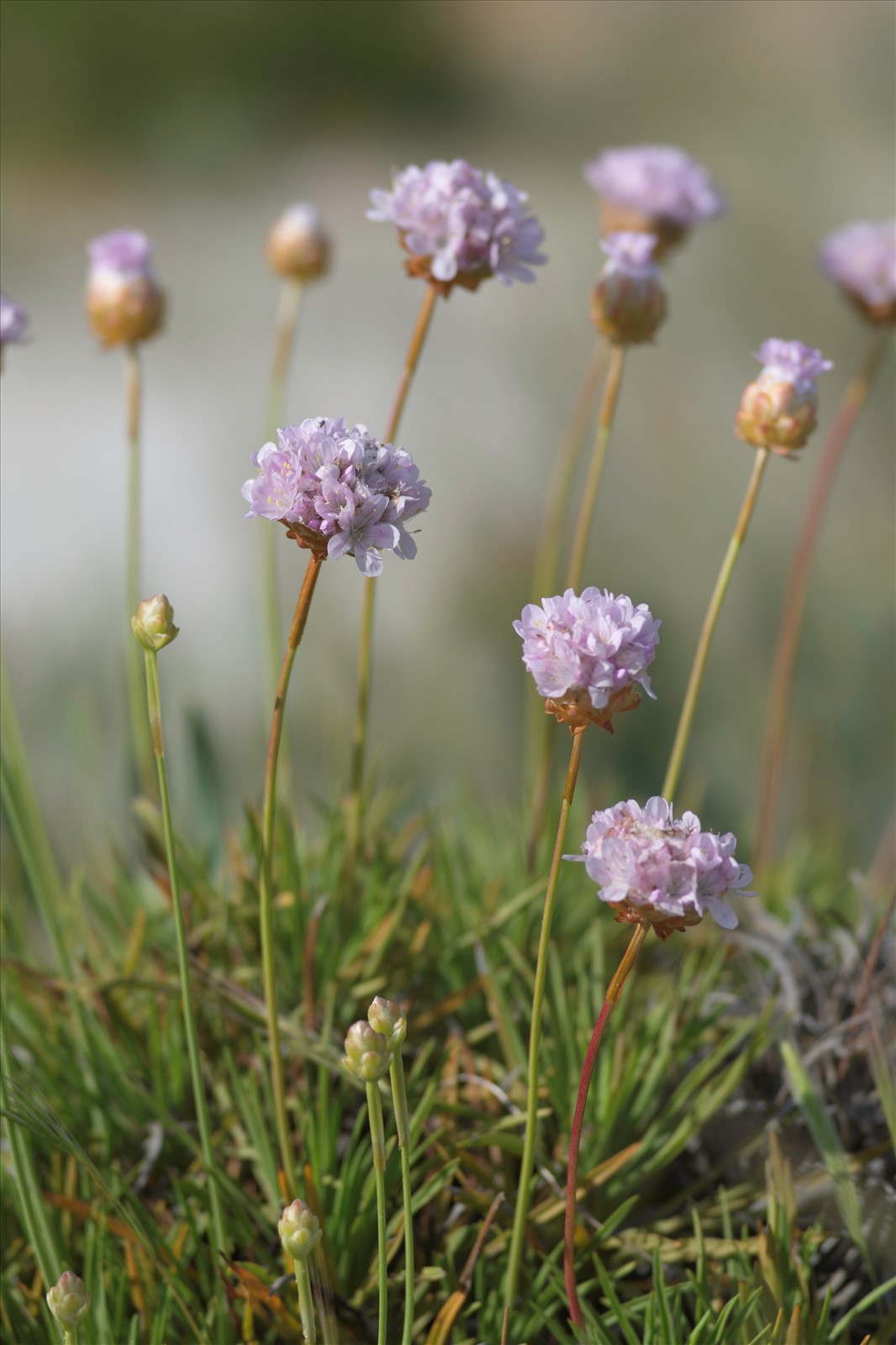 Plante vivace de 20-50 cm, glabre, à souche longue émettant des rameaux élevés au-dessus du sol et couverts des anciennes feuilles recourbées ; feuilles en faisceaux très denses, glaucescentes, raides, linéaires-acuminées, piquantes, à 1 nervure ; hampes fortes ; gaîne de 2-3 cm, égalant le capitule ; fleurs roses, grandes, en têtes de 3 cm de diam. ; involucre coriace, fauve ferrugineux, à folioles extérieures plus courtes, ovales-arrondies, non scarieuses aux bords ; bractéoles nulles ou rudimentaires ; calice prolongé en éperon à la base, à tube égalant le pédicelle et le limbe, à lobes triangulaires mucronés.