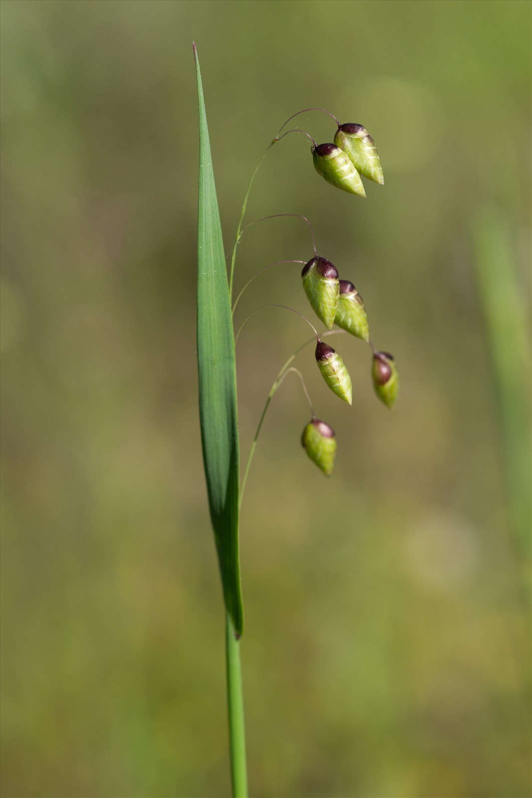 Plante annuelle de 20-50 cm, glabre, à racine fibreuse ; tiges dressées, souvent genouillées à la base ; feuilles planes, rudes, à gaine supérieure un peu renflée ; ligule longue, lancéolée ; panicule simple, penchée, unilatérale, peu fournie, à rameaux flexueux, solitaires ou géminés, ne portant que 1-2 épillets ; ceux-ci d'abord ovales-aigus et d'un blanc argenté, puis fauves, grands (10-15 mm), penchés, à 7-15 fleurs ; glumes ovales, souvent rougeâtres ; glumelle inférieure suborbiculaire en coeur ; caryopse suborbiculaire.