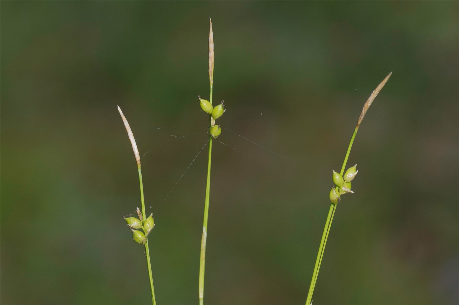 Plante vivace de 15 à 40 cm, glabre, à souche grêle rampante-stolonifère ; tige très grêle, presque lisse ; feuilles égalant la tige, très étroites (1 mm), un peu rudes ; épi mâle solitaire, linéaire, blanc, souvent dépassé par l'épi femelle supérieur ; 2 à 3 épis femelles rapprochés ou espacés, grêles, à 3 à 6 fleurs, dressés, pédonculés ; bractées toutes engainantes et scarieuses argentées, ainsi que les écailles ovales-apiculées ; 3 stigmates ; utricules blanchâtres, ovoïdes-subglobuleux (3,5 mm), nervés, à bec court dépassant l'écaille.