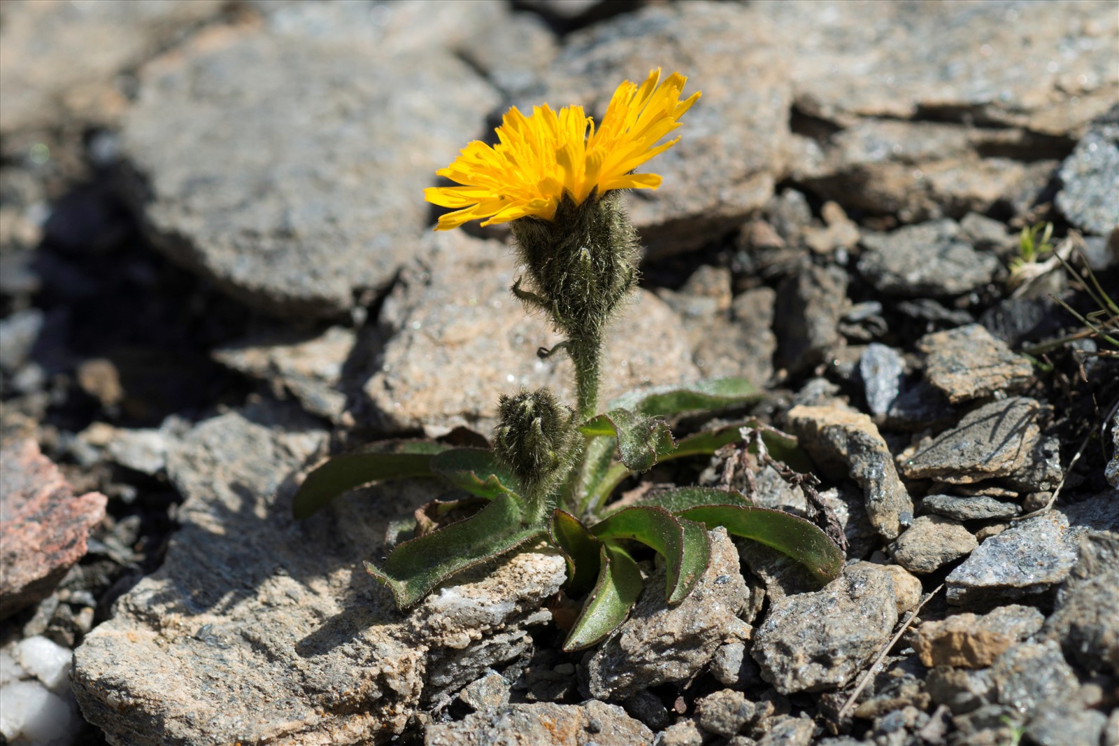 Racine vivace tronquée, pivotante ; tige très courte, de 2-5 cm, solitaire, dressée, simple, monocéphale, hérissée de poils étalés et ne portant qu'une ou deux feuilles ; feuilles entières ou un peu dentées, les radicales oblongues-obovales, arrondies ou subspatulées ou oblongues-lancéolées, glabres ou un peu poilues ; involucre hérissé de longs poils mous ; fleurs jaunes.