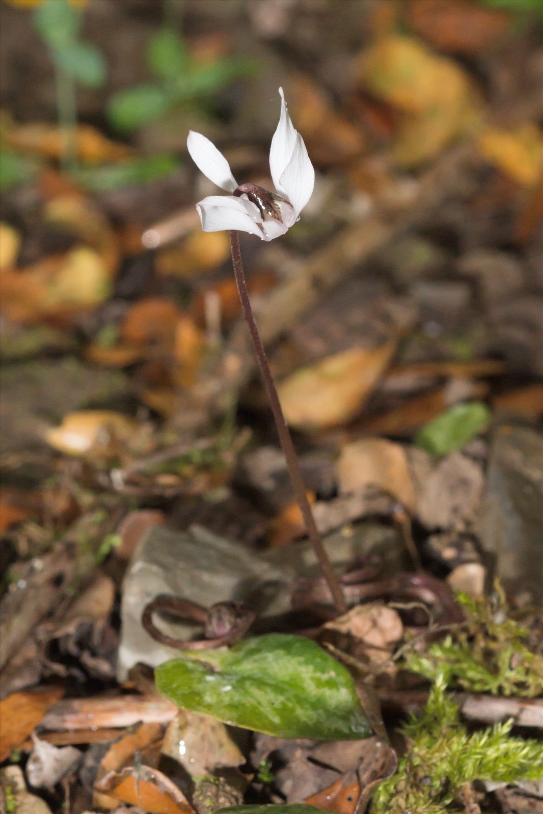 Plante vivace de 10-25 cm, à tubercule du volume d'une noisette (1-2 cm de diam), globuleux-déprimé, nu ; feuilles moins grandes, plus maculées de blanc en dessus, ovales en coeur, sinuées-anguleuses, à lobes obtus et mucronés, non denticulées au bord ; hampes et pétioles très grêles à la base, épaissis au milieu; calice dépassant le tube de la corolle, à lobes aigus ; corolle petite (13-18 mm), blanchâtre, à gorge rose, entière, à lobes lancéolés-linéaires, 5 fois plus longs que le tube ; style conique, non saillant.