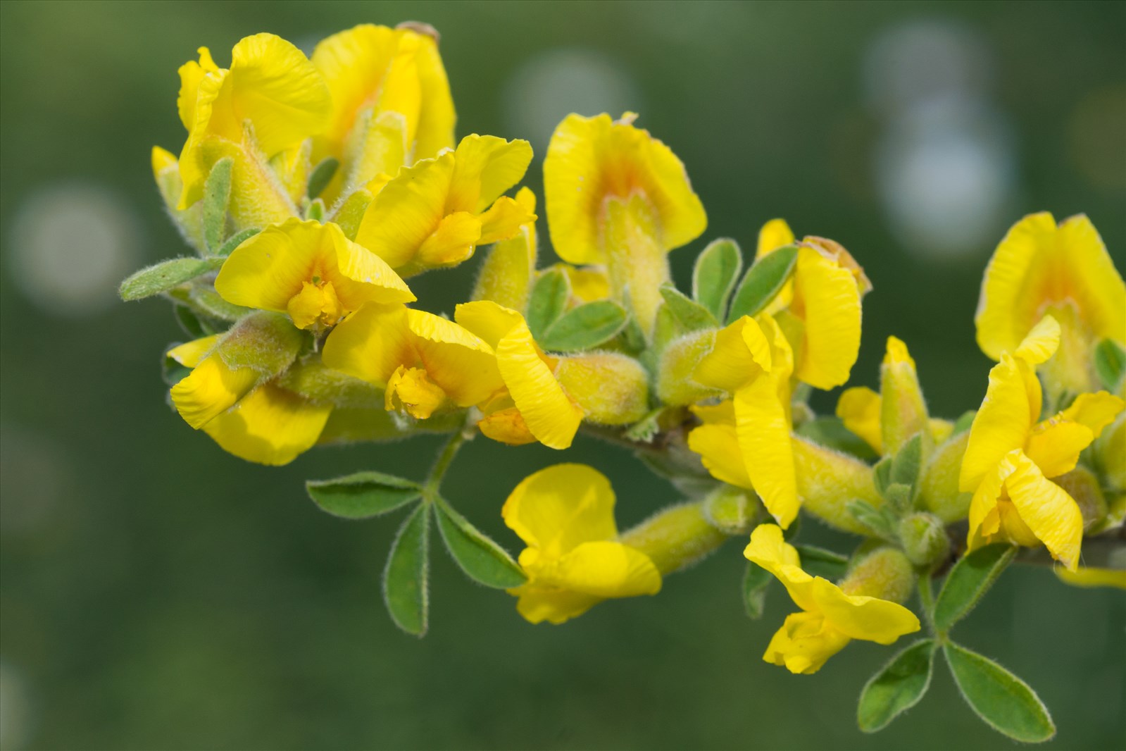 Sous-arbrisseau de 30-80 cm, dressé ou ascendant, à jeunes rameaux hérissés de longs poils étalés ; feuilles pétiolées, à folioles obovales, velues sur les deux faces, noircissant par la dessiccation ; fleurs latérales, en grappes feuillées sur les rameaux anciens ; pédicelles de moitié plus courts que le calice ; calice à poils étalés, allongé, tubuleux, à lèvres divariquées, la supérieure à 2 dents obtuses, à peine arquées en dehors ; étendard plus long que la carène ; gousse de 25-35 mm sur 7-8, en faux, à valves planes, hérissée de longs poils étalés.
