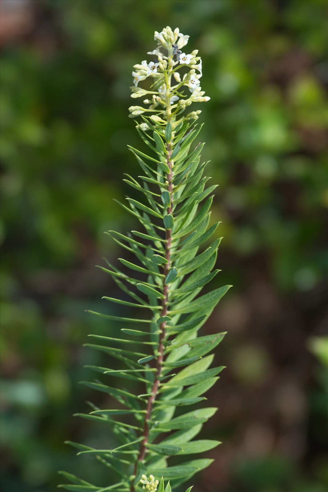 Arbrisseau de 60 cm à 1-2 mètres, à tiges dressées, à rameaux effilés, cylindriques, lisses, bruns, pubérulents au sommet, feuilles dans toute leur longueur ; feuilles glabres, subcoriacés, persistantes pendant un an, longues de 3-4 cm sur 3-7 mm, lancéolées-linéaires, uninervées; fleurs blanches, odorantes, la plupart caduques, pédicellées, disposées en panicule terminale, à pédoncules et pédicelles blancs-tomenteux ; périanthe blanc-soyeux, à lobes ovales un peu plus courts que le tube ; baie nue, ovoïde, rouge.