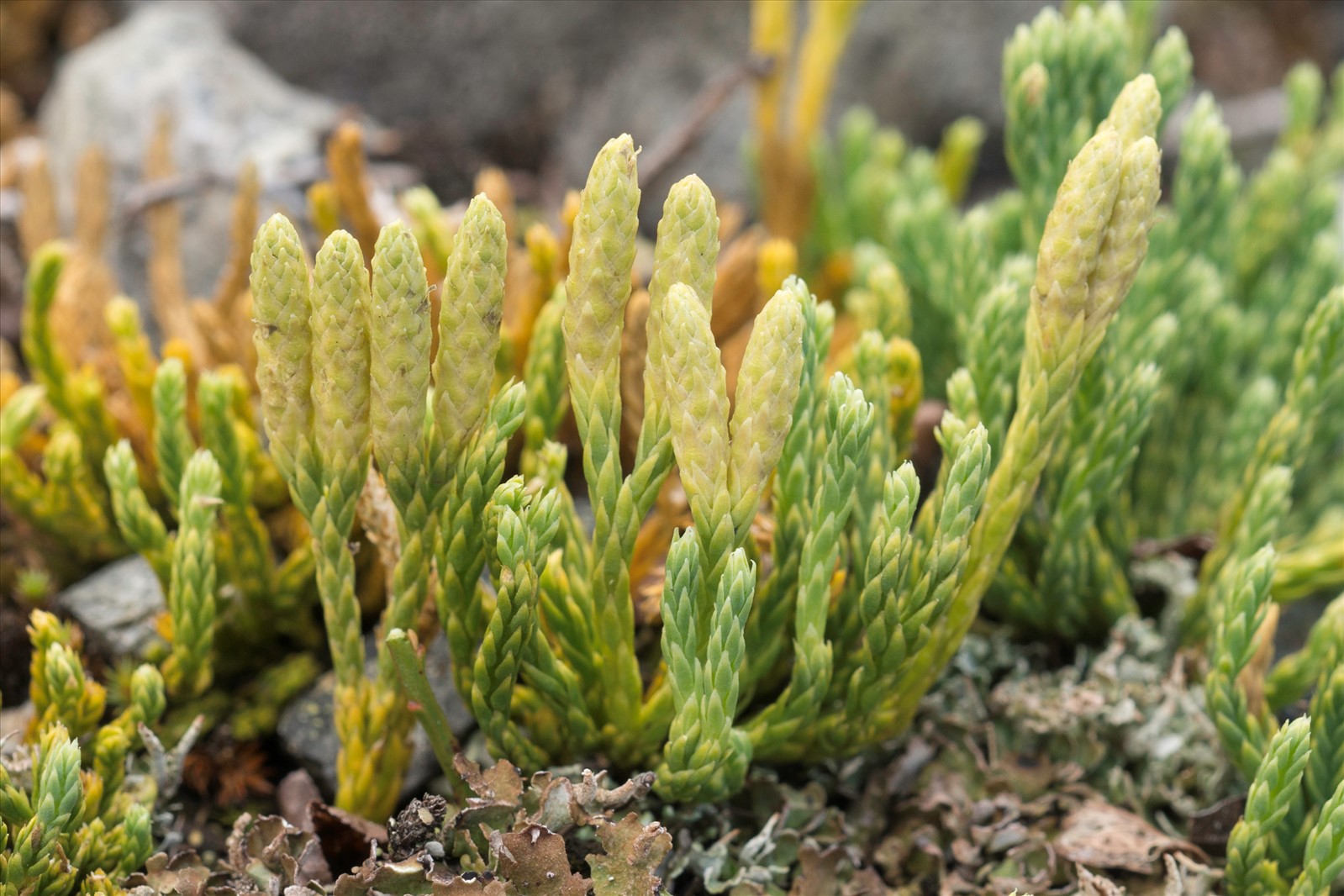 Développe des tiges couchées rampantes, atteignant 60 cm de long, sur lesquelles se dressent des rameaux écailleux vert glauque, dressés et fourchus, hauts de 2 à 10 cm. L'ensemble évoque un petit rameau de cyprès couché au sol, aux petites feuilles en écailles disposées sur quatre rangs. Certains rameaux dressés sont surmontés d'un à deux épis compacts de sporophylles, dont les écailles portent des sporanges produisant des spores, au rôle dévolu à la reproduction de la plante.