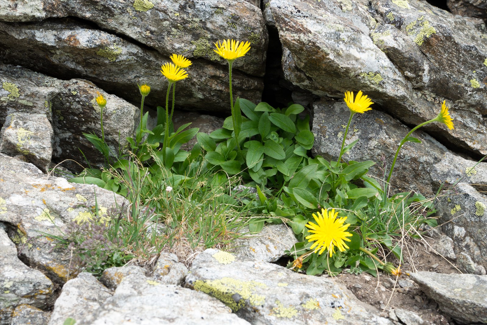 Plante vivace de 1-3 dm, à tige dressée, toujours simple, pubescente ou presque glabre, souvent glanduleuse au sommet ; feuilles radicales entières ou obscurément sinuées ou dentées, ovales ou oblongues, obtuses, pubescentes ou presque glabres, atténuées en pétiole, ni tronquées, ni cordées, les caulinaires entières ou offrant quelques dents dans leur moitié inférieure, sessiles, demi-embrassantes, non auriculées ; involucre hispide à folioles lancéolées-linéaires, acuminées ; capitule à fleurs jaunes, grand, toujours solitaire, terminal.