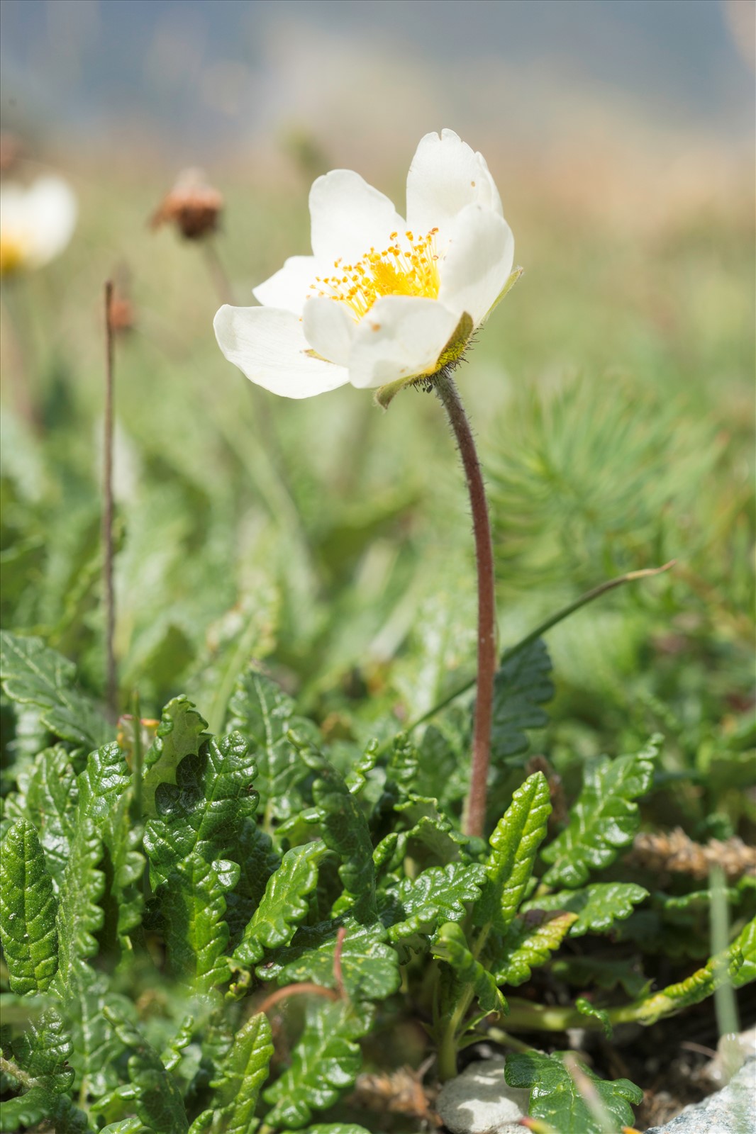 Plante vivace de 5-15 cm, à tiges sous-ligneuses, couchées-étalées, très rameuses ; feuilles oblongues-obtuses, arrondies à la base, profondément dentées, vertes en dessus, blanches-tomenteuses en dessous ; stipules linéaires, soudées au pétiole ; fleurs blanches, grandes, solitaires sur de long pédoncules terminaux, nus, velus; calice pubescent, à 7-9 lobes linéaires, égaux, sur 1 seul rang ; 7-9 pétales, ovales, 1-2 fois plus longs que le calice ; étamines nombreuses ; styles subterminaux, longs, accrescents ; ovaire libre et supère ; fruit sec, composé de nombreux carpelles velus, monospermes, indéhiscents, surmontés d'une longue arête plumeuse, réunis sur un réceptacle subconcave.