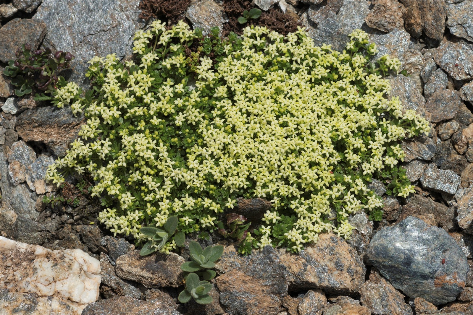Plante vivace, couchée-rampante, gazonnante, glabre, noircissant un peu par la dessiccation ; tiges nues à la base, redressées, fragiles, très lisses, à entrenoeuds supérieurs allongés ; feuilles verticillées par 5-6, linéaires-oblongues, subaiguës, mutiques, charnues, lisses, à nervure dorsale non apparente, les supérieures plus courtes et en verticilles écartés ; fleurs blanches, grandes (3-4 mm), en petites cymes terminales compactes dépassant les feuilles ; corolle à lobes elliptiques-obtus; fruits rares, gros (3 mm), glabres et lisses.