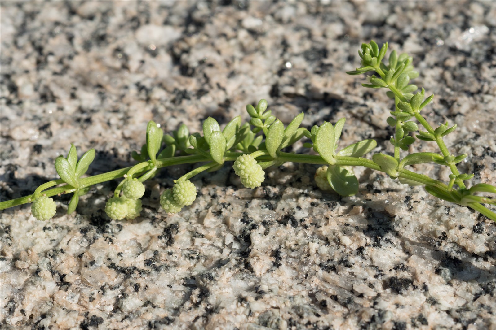 Plante annuelle de 10-40 cm, glabre, à racine grêle ; tiges un peu épaisses, rameuses dés la base, diffuses ou ascendantes, un peu scabres ; feuilles verticillées par 5-6, lancéolées-linéaires, brièvement mucronées, glabres en dessus, scabres de haut en bas, à bords munis d'aiguillons dirigés en haut ; fleurs blanchâtres, en petites cymes axillaires triflores plus courtes que les feuilles, les 2 fleurs latérales mâles et stériles ; pédicelles fructifères penchés ; corolle à lobes oblongs-aigus ; fruits solitaires, gros, couverts de verrues coniques, blanchâtres.