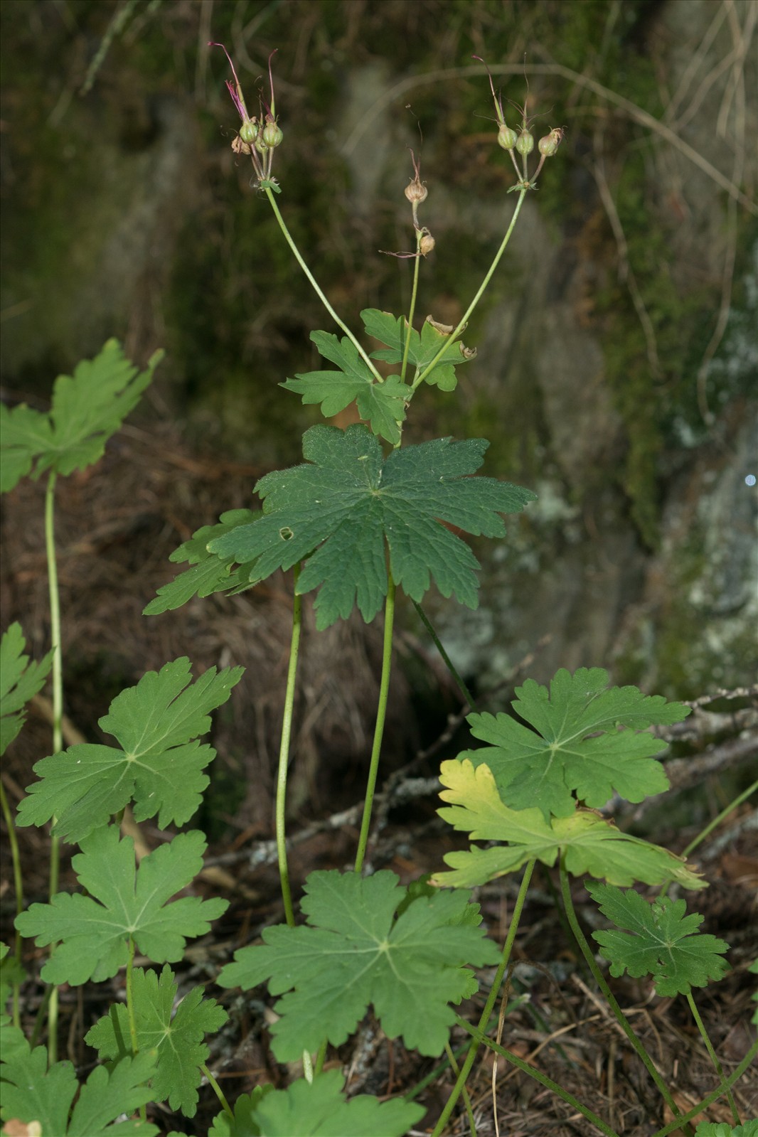Plante vivace, pubescent à souche épaisse ; tiges de 10-30 cm, nues jusqu'aux bifurcations ; feuilles orbiculaires, palmatipartites, à 5-7 lobes crénelés-dentés, les supérieures opposées et courtement pétiolées ; fleurs rouges, grandes, en cymes corymbiformes ; pédoncules biflores, plus longs que la feuille ; sépales étalés, rougeâtres, aristés, à 3 nervures ; pétales entiers, à onglet long et cilié ; étamines 2-3 fois plus longues que le calice, à filets glabres ; carpelles glabres.