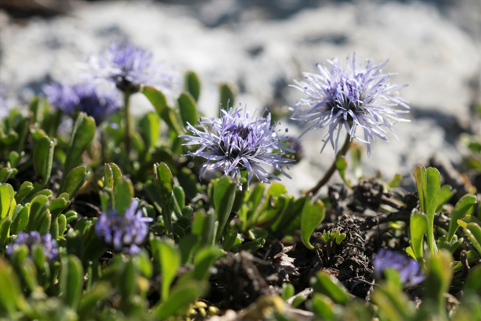 Sous-arbrisseau petit, à tiges couchées-radicantes, formant des gazons solides et lâches ; feuilles toutes en rosettes écartées à la base des pédoncules, petites, charnues, caduques, spatulées en coin, atténuées en long pétiole, échancrées en coeur ou tridentées au sommet, larges de 4-7 mm, à 1-3 nervures ; fleurs d'un bleu cendré, en tête large à peine de 1 cm, sur des pédoncules dépassant les feuilles, d'abord courts, à la fin longs de 515 cm, presque nus ; involucre poilu, réceptacle glabre, calice à tube hérissé sur les angles ; corolle à lèvre inférieure de moitié plus longue que la supérieure, tripartite, fendue jusqu'au de la du milieu.
