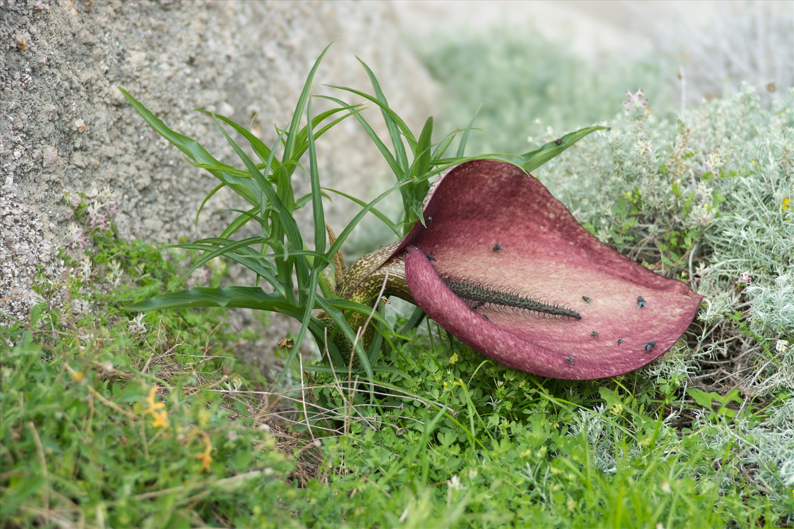 Plante vivace, à gros tubercule arrondi ; feuilles à pétioles dilatés en gaines embrassant la hampe presque jusque sous la spathe, pédatiséquées, à segments décurrents linéaires ou lancéolés ; spathe grande, violet livide et velue à l'intérieur ; spadice égalant les trois quarts de la spathe, à massue cylindracée d'un pourpre noir entièrement garnie de longs filaments ; inflorescences mâle et femelle séparées par un intervalle et par quelques rangées de gros filaments.