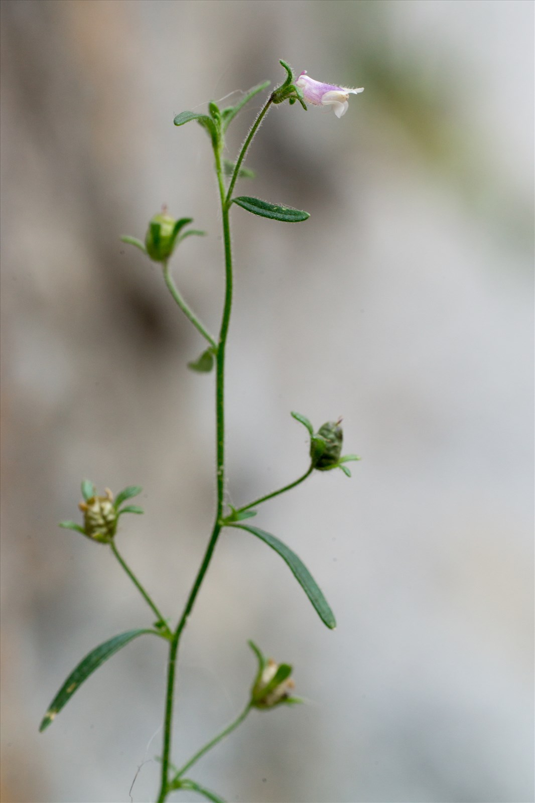 Plante annuelle de 8-25 cm, pubescente-glanduleuse, dressée ; feuilles supérieurs alternes, atténuées en pétiole, oblongues ou lancéolées-linéaires, obtuses ; fleurs d'un violet pâle à palais jaune ne fermant pas la gorge, petites, axillaires, écartées, en grappes lâches, feuillées ; pédoncules dressés, bien plus longs que la fleur ; calice pubescent, à lobes linéaires-spatulés ; corolle de 6-8 mm, à éperon conique, obtus, 2-3 fois plus court qu'elle ; capsule ovoïde-oblique, un peu plus courte que le calice, s'ouvrant au sommet par deux larges trous ; graines ovoïdes, lisses.