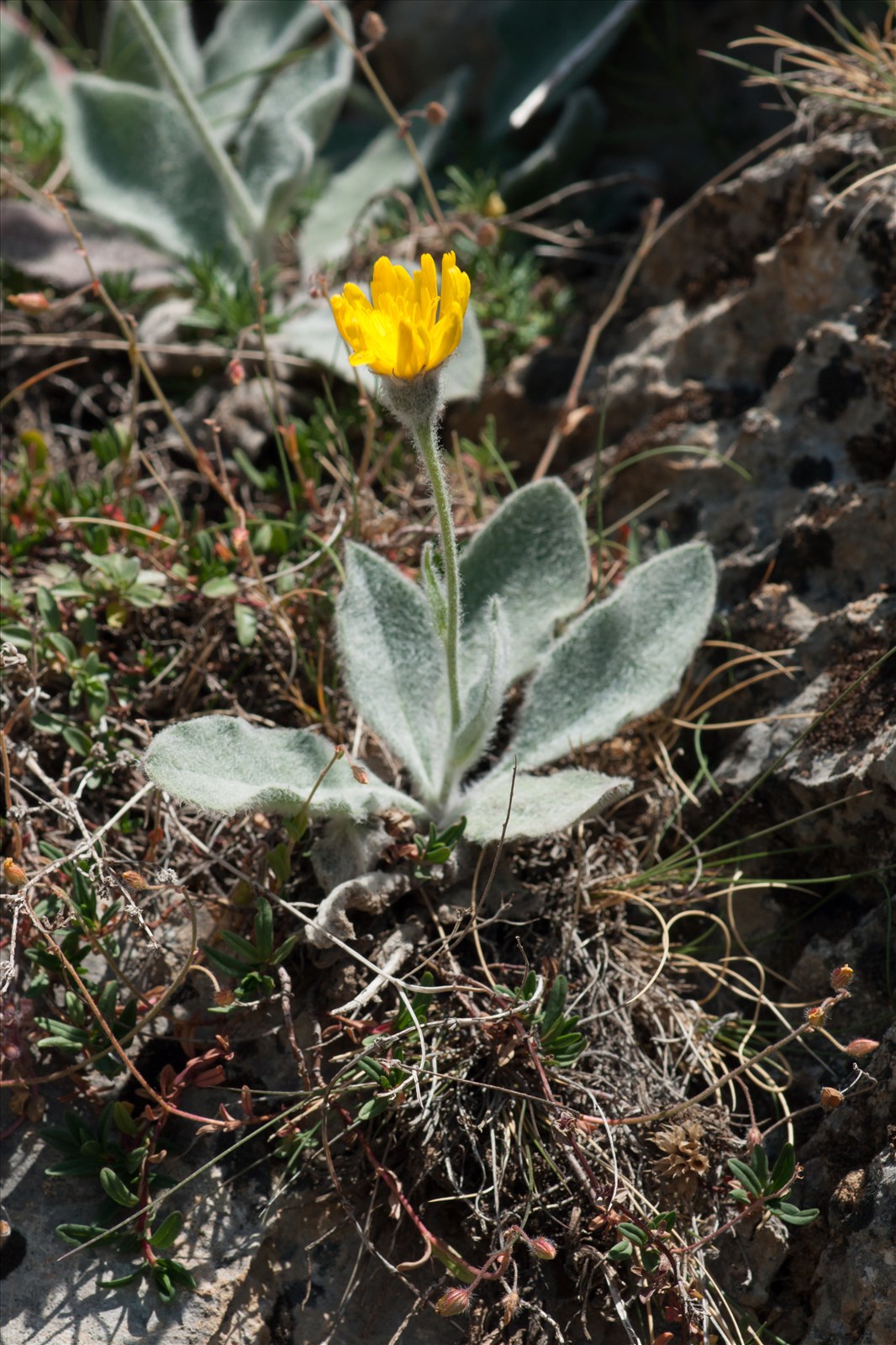 Plante vivace phyllopode de 12-40 cm entièrement tomenteuse à poils plumeux, dressée, rameuse à rameaux très longs terminés par 1-3 capitules ; feuilles épaisses, couvertes sur les deux faces d'un abondant tomentum feutré, les inférieures grandes, elliptiques-lancéolées ou ovales-lancéolées, très entières ou obscurément sinuées, pétiolées, les caulinaires peu nombreuses lancéolées, sessiles ou demi-embrassantes ; involucre très laineux à folioles très aiguës ; fleurs jaunes.
