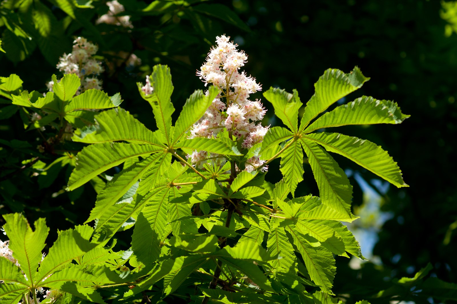 Arbre élevé, robuste, touffu ; feuilles grandes, opposées, longuement pétiolées, digitées, à 5-9 folioles obovales en coin, acuminées, inégalement dentées, vertes, à la fin glabres, sans stipules ; fleurs irrégulières, blanches, tachées de rouge et de jaune, grandes, en thyrses pyramidaux, terminaux, dressés ; calice monosépale, en cloche, à 5 dents inégales, caduques ; 4-5 pétales, inégaux, chiffonnés, pubescents ; 7 étamines, inégales, arquées en dehors, insérées sur un disque hypogyne ; 4 style et 1 stigmate aigu ; ovaire libre ; capsule très grosse, globuleuse, coriace, épineuse, verdâtre, s'ouvrant en 3 valves, à 1-2 graines très grosses, subglobuleuses, luisantes, à hile orbiculaire.
