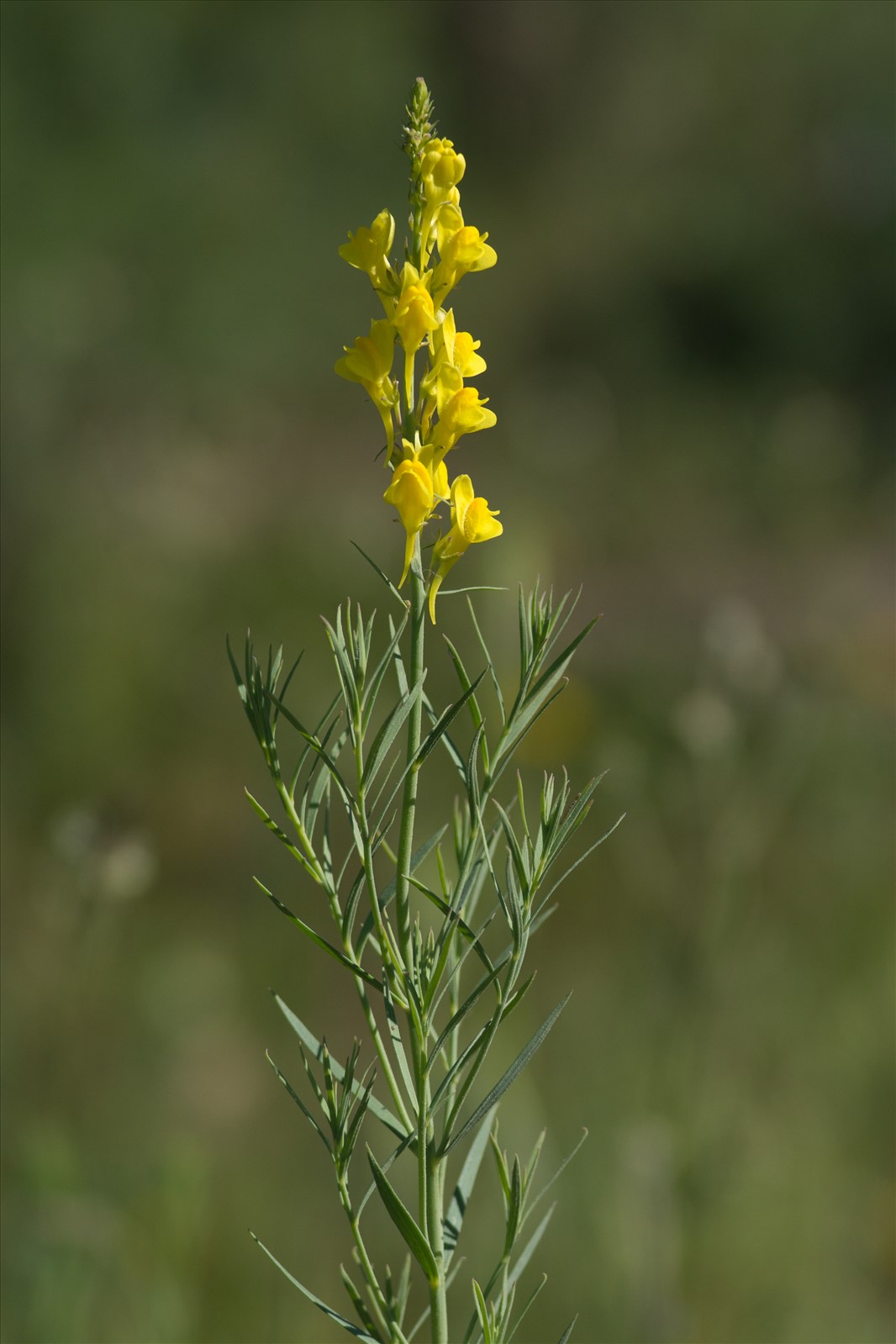 Plante vivace de 30-60 cm, entièrement glabre ; tiges dressées, fortes, simples ou peu rameuses, densément feuillées ; feuilles éparses, lancéolées-linéaires aiguës, épaisses, un peu charnues, très glauques ; fleurs d'un beau jaune citron à palais orangé, grandes, en grappes spiciformes très serrées ; bractées linéaires, réfléchies ; calice glabre, à lobes lancéolés-aigus ; corolle de 16-22 mm, à éperon un peu courbé et aussi long qu'elle ; capsule de 4-6 mm, subglobuleuse, 1 fois plus longue que le calice.