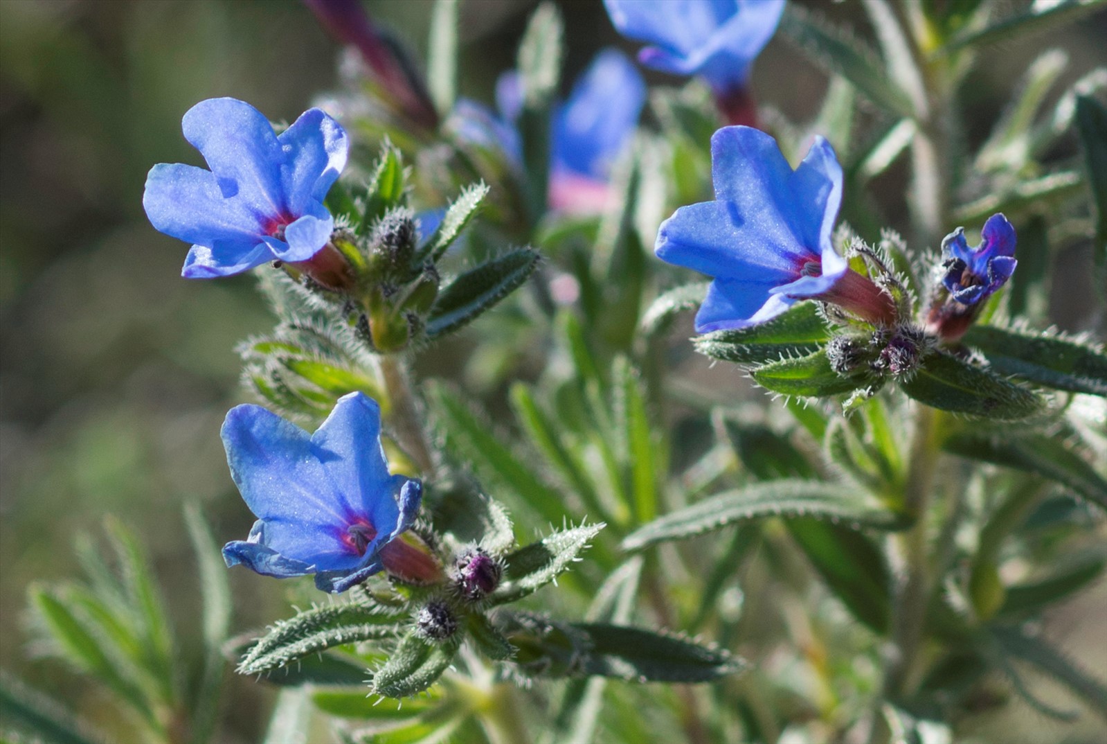 Sous arbrisseau de 20-50 cm, velu-hérissé, d'un vert blanchâtre, à tiges ligneuses, dressées, tortueuses, très rameuses en buisson ; feuilles linéaires, sessiles, roulées par les bords, hispides-tuberculeuses en dessus et sur la nervure dorsale, tomenteuses en dessous ; fleurs pourpres ou bleues, assez grandes, subsessiles, en grappes terminales courtes et peu fournies ; calice hérissé, à lobes linéaires ; corolle de 12-15 mm, entièrement glabre, 2 fois aussi longue que le calice, à tube saillant ; étamines incluses ; stigmate entier ; carpelles blanchâtres, lisses, oblongs, carénés, obtus au sommet.