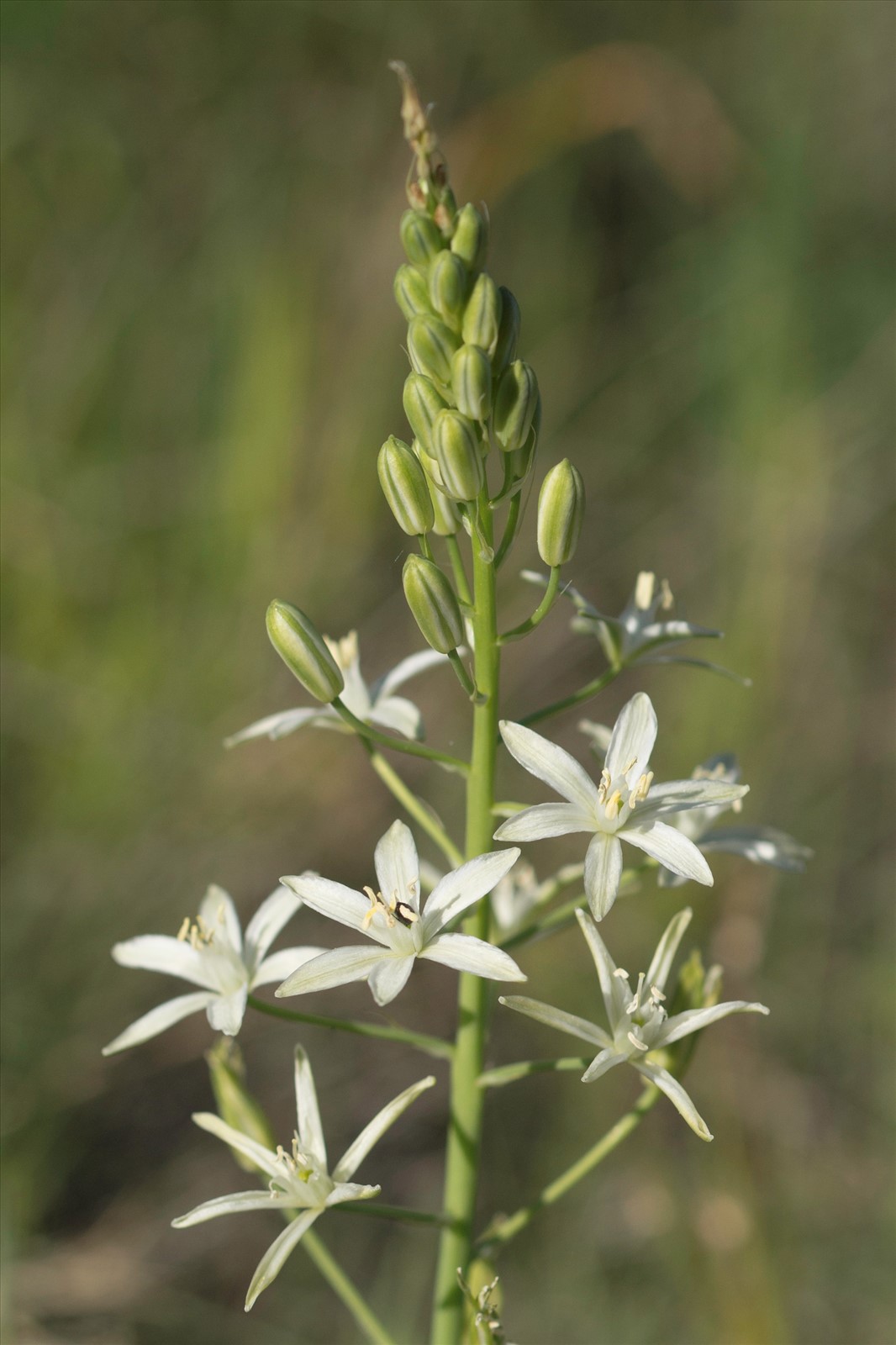 Plante vivace de 30-60 cm, glabre, à bulbe ovale ; feuilles étalées, linéaires-élargies, glaucescentes, plus courtes que la tige raide, persistantes à la floraison ; fleurs assez petites, d'un blanc pur en dedans, ne jaunissant pas, en grappe allongée; pédicelles égaux, d'abord étalés, à la fin dressés-appliques ; bractées longuement acuminées, égalant à peu près les pédicelles, dépassant du double le bouton floral ; filets longuement atténués, dépassant peu le milieu du périanthe ; style plus long que les étamines ; capsule ovoïde à 3 sillons.