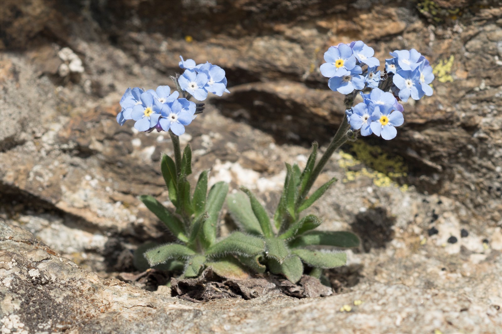 Plante vivace de 8-20 cm, velue-hérissée, à souche longue et épaisse ; tiges rigides, un peu épaisses, rameuses dans le haut ; feuilles oblongues-lancéolées, les inférieures longuement pétiolées ; fleurs roses puis d'un beau bleu, assez grandes, en grappes nues, à la fin raides, courtes, peu lâches ; pédicelles fructifères raides, un peu épaissis, dressés ou dressés-étalés, les inférieurs un peu plus longs que le calice ; calice subargenté, allongé, à tube muni de rares poils crochus, à lobes fructifères dressés-étalés ; corolle de 4-8 mm, à limbe plan plus long que son tube qui égale le calice ; carpelles gros, ovales-arrondis, non carénés sur une face.