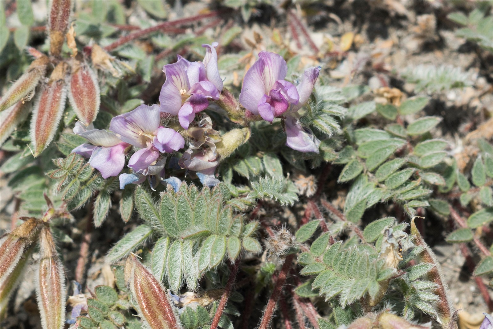 Plante de 5-15 cm, velue-blanchâtre, acaule, à feuilles et pédoncules naissant d'une souche écailleuse ; feuilles à 7-10 paires de folioles ovales ou elliptiques ; stipules soudées ; fleurs d'un bleu clair, étalées en tout sens, 5 15 en grappes ovoïdes un peu lâches ; calice velu, à tube ne se fendant pas, à dents égalant environ la moitié du tube ; étendard ovale, de moitié plus long que la carène longuement apiculée ; gousses de 12-45 mm sur 3-4, très étalées ou penchées, linéaires-oblongues, velues ; carpophore égalant la moitié du tube du calice.