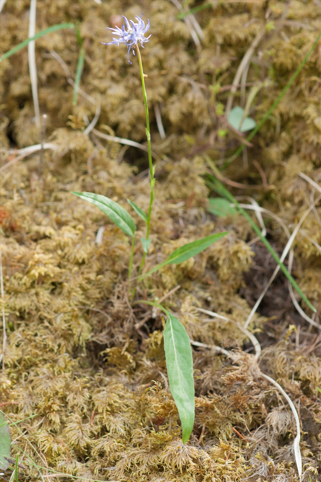 Plante vivace de 10 à 20 cm, glabre, à souche grosse, fragile, rameuse, émettant plusieurs tiges grêles, arquées ou flexueuses, très feuillées. Feuilles molles, presque toutes pétiolées, les radicales ovales en coeur, presque aussi larges que longues, dentées, les caulinaires lancéolées ou lancéolées-linéaires, entières ou dentées. Fleurs bleues, en têtes toujours globuleuses de 12 à 15 mm de diamètre. Bractées extérieures lancéolées-linéaires, longuement acuminées, ciliées, égalant à peu près les fleurs. Calice à lobes lancéolés, ciliés. 3 stigmates.