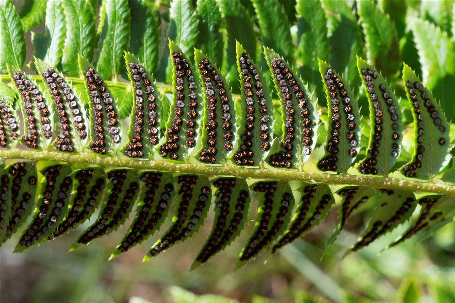 Plante vivace de 15-45 cm, nullement polymorphe, à souche courte et épaisse ; feuilles coriaces, restant vertes tout l'hiver, à rachis très écailleux, étroitement oblongues-lancéolées, simplement pennatiséquées, à segments pétiolulés, lancéolés, courbés en faux vers le haut, denticulés-spinuleux sur les bords, à base latérale supérieure tronquée et auriculée ; sores disposés sur 2 lignes régulières parallèles à la nervure médiane du segment.