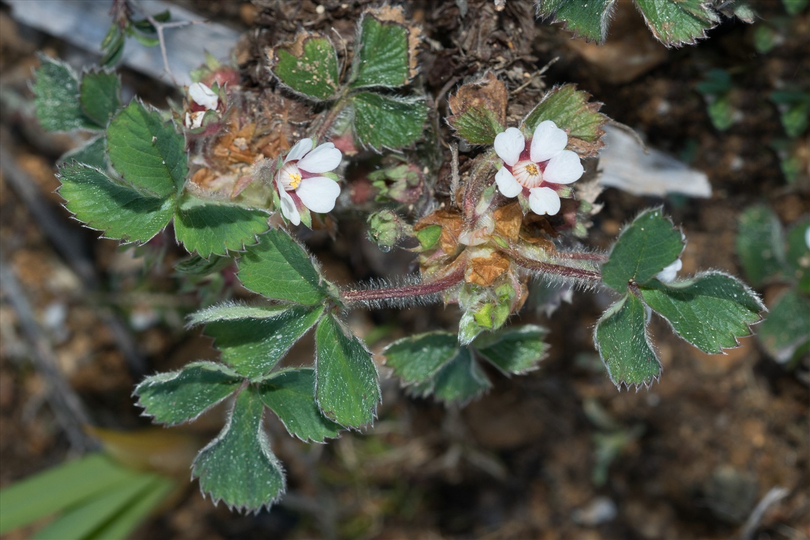 Plante vivace de 5-15 cm, velue-soyeuse, à souche épaisse, non stolonifère; tiges très grêles, bien plus courtes que les feuilles, couvertes, ainsi que les pétioles et les pédicelles, de poils mous étalés ; feuilles radicales à 3 folioles obovales-arrondies, velues-soyeuses, munies tout autour de 16-22 dents assez fines et rapprochées, non conniventes ; les caulinaires 1 ou 2, simples ; fleurs d'un blanc rosé, petites (6-8 mm de diam.), 1-2 sur des pédicelles filiformes ; calicule égalant presque le calice rougeâtre en dedans ; pétales peu émarginés, plus courts que le calice ; filets des étamines connivents en tube fermé au sommet.