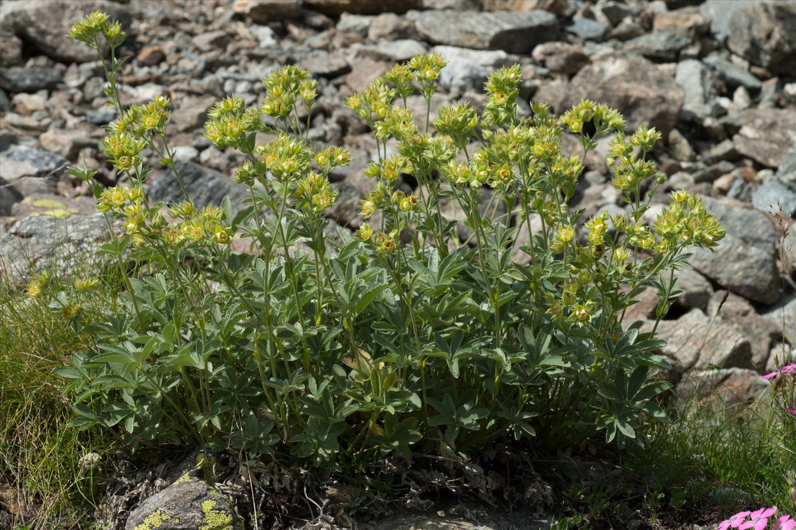 Plante vivace de 20-40 cm, tomenteuse-blanchâtre, à souche ligneuse ; tiges dépassant longuement les feuilles, velues-tomenteuses ainsi que les pétioles ; feuilles radicales digitées, à 5-7 folioles oblongues, soyeuses-argentées en dessus, munies jusqu'au-dessous du milieu de 12-20 dents conniventes ; les caulinaires digitées ou trifoliolées ; fleurs blanches, en corymbe serré, à pédicelles velus ; pétales obovales, peu émarginés, plus courts que le calice ; calicule à lobes linéaires dépassant le calice ; filets des étamines et carpelles hérissés.
