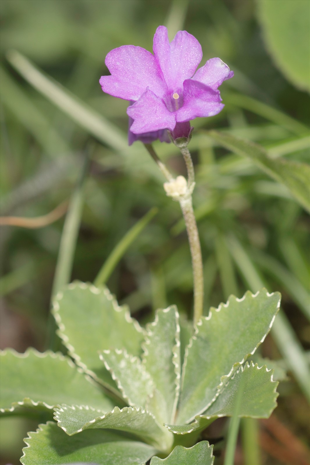 Plante vivace de 5-12 cm, glabre, à souche très forte ; hampes dépassant un peu les feuilles ; feuilles obovales-oblongues, lisses, glabres, fortement dentées, bordées d'une couche de poussière blanche ; fleurs d'un rose violet, odorantes, 2-8 en ombelles dressées ; pédicelles presque égaux, bien plus longs que l'involucre à folioles courtes et ovales ; calice farineux, à tube arrondi, à dents courtes, ovales ; corolle assez grande, à tube 3 fois plus long que le calice ; à gorge nue, à lobes échancrés ; capsule subglobuleuse, dépassant un peu le calice.